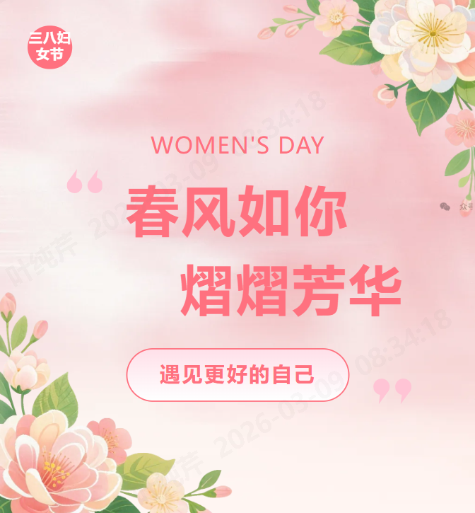 值此三八国际妇女节,公司向全体女员工致以诚挚问候与美好祝福!祝各位节日快乐、芳华永驻、顺遂安康,以巾帼之姿,与公司同心同行、共赴新程!