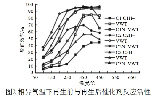 在0.05%的锘、0.05%的氨、3%的氧气、载气8.4L/min, 空速达到4000h–1 环境下,反应气温会发生变化,3类催化剂再生前与再生后的反应活性见下图。
