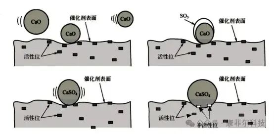 飞灰中游离CaO与SO3反应形成的CaSO4可吸附在催化剂表面,从而阻止了反应物向催化剂表面扩散并进入催化剂内部。多通过控制催化剂内部孔径分布和采用适当节距等方法来减少CaSO4对化剂的影响。