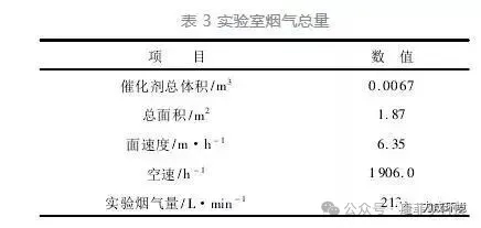 通过参数可以计算得到实验室烟气总量,装载催化剂的总表面积及面速度,如表3所示。