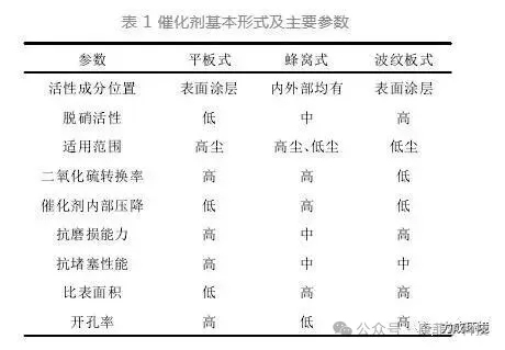 钒钛类催化剂在电厂脱硝中应用较多,该类催化剂主要有: V2O5/TiO2、V2O5-WO3/ TiO2、V2O5-MoO3/TiO2和 V2O5-WO3-MoO3/TiO2等。 V2O5是催化剂中最主要活性成分和必备组分,为主催化剂。WO3和 MoO3为催化剂中加入的少量物质,是助催化剂,本身没有活性或活性很小,但却能显著地改善催化剂的活性、选择性和热稳定性。 由于V2O5-WO3/TiO2比V2O5/TiO2更具活性和康养护,抗水中毒性,已经逐渐取代 V2O5/ TiO2。催化剂成分、形式及孔径等在一定程度上决定了催化剂的脱硝效率。催化剂基本形式及主要参数见表 1。